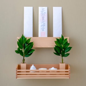 小さなスペースでも、設置が可能な大きすぎないサイズ。格子組の棚は神具の落下対策にもなり安全な構造。自然にお部屋に馴染む祈りのインテリアはいかがでしょうか?