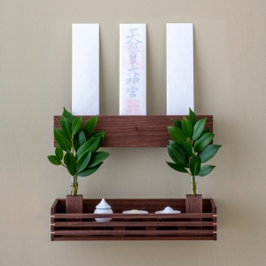 小さなスペースでも、設置が可能な大きすぎないサイズ。格子組の棚は神具の落下対策にもなり安全な構造。自然にお部屋に馴染む祈りのインテリアはいかがでしょうか?