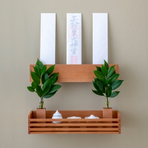 小さなスペースでも、設置が可能な大きすぎないサイズ。格子組の棚は神具の落下対策にもなり安全な構造。自然にお部屋に馴染む祈りのインテリアはいかがでしょうか?